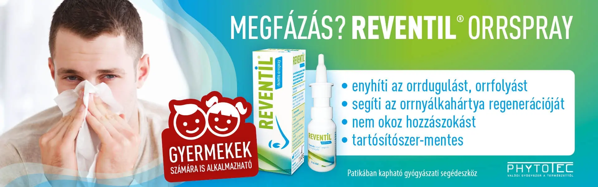 Az egyedi összetételű Reventil orrspray az orrnyálkahártya-gyulladás (rhinitis) és az orrmelléküreg-gyulladás (rhinosinusitis) tüneteinek megelőzésére és kezelésére szolgál. Egyedülálló összetevője a sejtvédő Ectoin®, amelynek fő jellemzője, hogy védi az orrnyálkahártyát a kiszáradástól, és elősegíti annak mielőbbi regenerálódását, gyógyulását. Másik fő összetevője a tengeri sós oldat, amely segít megszüntetni az orrdugulást, mivel lohasztja az orrnyálkahártya duzzanatát. Tartósítószert nem tartalmaz.